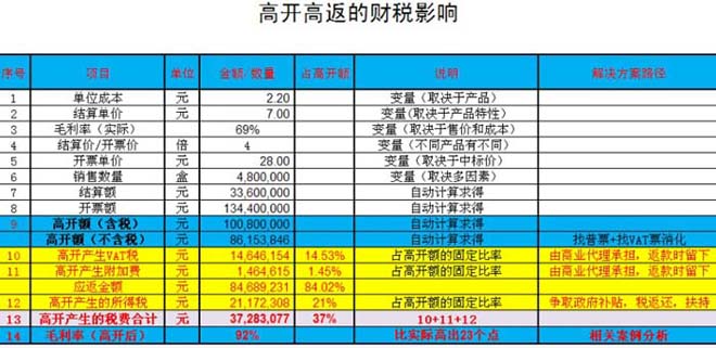 從上表中可看到:當(dāng)高開票金額達(dá)到1億元的時候,由此會給藥企帶來額外的稅費合計3728萬,其中,包括產(chǎn)生的增值稅和相關(guān)稅金附加1611萬,這兩項合計占高開額的15.98%,另一項是產(chǎn)生的額外所得稅費用2117,占高開額的21%,這三項合計占高開額的37%(這個是固定產(chǎn)生的比率)。
