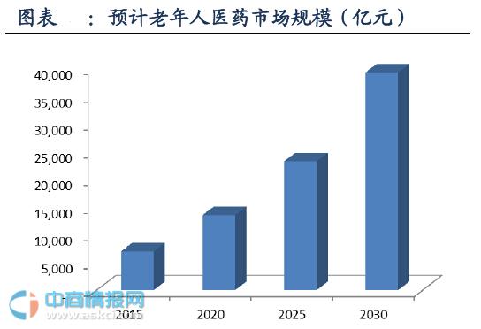 根據(jù)人口年齡結(jié)構(gòu)、死亡率、中國和全球醫(yī)療費(fèi)用增長率經(jīng)驗(yàn)測算:5年內(nèi),老年人醫(yī)藥市場規(guī)模將會迅速擴(kuò)容至1.36萬億元,幾乎是2015年的2倍,而10年內(nèi),該市場規(guī)模則將達(dá)到2.4萬億元,達(dá)到2015年的3倍。