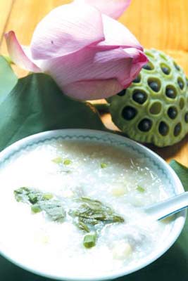 荷花含有槲皮素和樨草素等成分,清香化痰,具有清暑寧神的作用,不失為鎮(zhèn)心益氣,養(yǎng)顏輕身的美容佳品。用粳米100克煮到將熟時,放入已清洗干凈的荷葉和荷花,再煮10分鐘左右即可食用。粥色碧綠微亮,令人食欲大開。常服荷花粥,能改善面部油脂分泌旺盛、減輕痤瘡,使面色紅潤、容光煥發(fā)。